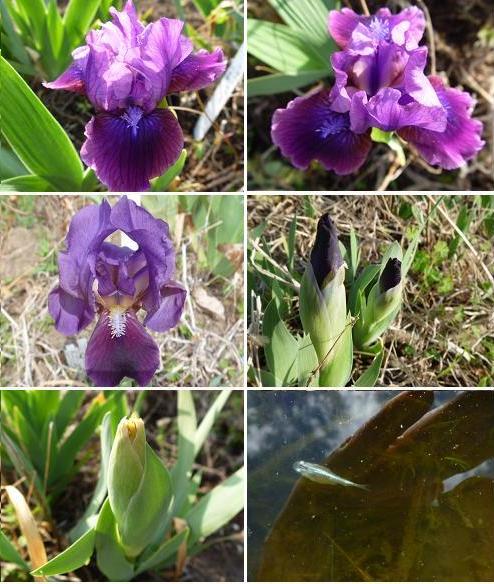 | ◆2013/4/10のジャーマンアイリス畑の様子: ようやくミニ品種のジャーマンアイリスの花茎が伸びつぼみがあると思ったら 花が開花しました。草丈5cmで花径4cmのドワーフ品種プラムツイスト(紫花)と 商品一覧にもあるA005:ミニ紫ヒゲ白です。 他にもボチボチつぼみが見られます。 畑のメダカ池でもメダカが産卵を始めました。本格的春の到来です(^^♪ |