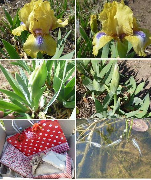 | ◆2013/4/12のジャーマンアイリス畑の様子: 昨日の夜はかなり寒さが戻りましたが、今日の日中は天気が良かったです。 つぼみが出来てなかなか咲かなかった「D001:Add It Up」がようやく咲きました♪ 黄色の花に薄紫のヒゲの明るい花です。 他のドワーフ品種やミニ品種も、花茎が伸びてつぼみが出来ています。 今日の陽気で畑のメダカ池でもメダカが気持ち良さそうに日光浴してました(^^♪ 来週にご結婚式をされるお客様から、結婚式でご両家のご両親にプレゼントする ジャーマンアイリス株の注文があり、本日、株を堀り上げプレゼント用の包装をして 発送しました。 プレゼント用のジャーマンアイリス株の場合は、写真のようなプレゼントのための 包装も対応致しますので、お申し付けください。(1包装:500円で対応) |