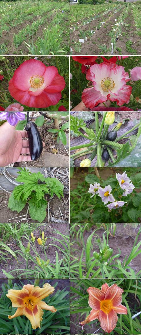 | ◆2013/6/3のジャーマンアイリス畑の様子: 畑のジャーマンアイリスの花もほとんどが終了し、昨年11月に植替え した株の花が、ちらほら残っているだけです。 ジャーマンアイリスは植え替える時期が遅いと、翌年の春は通常より 花も小さいし、花数も少なく、花が咲く時期も遅れます!そのような 時は、翌年の開花に期待しましょう。 ジャーマンアイリス畑の隣のお宅の庭に咲いていたポピーも花が終盤 になってきました。 畑の隅で作っている野菜も成長中です。 第1番目のナスが採れそうです。ズッキーニも実が出来始めています。 種を撒いたゴウヤの芽も出ました。ジャガイモも花を咲かせるほど大 きくなっています。 ジャーマンアイリスの花は終わりですが、畑ではヘメロカリスの花茎 が伸びて花のつぼみもちらほら見うけられます。 早咲きの「ブラックアイステラ」や交配ヘメロカリスの花も咲き出し ています。6月後半から7月に見ごろになると思います。 |