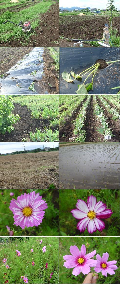 | ◆2013/6/22のジャーマンアイリス畑の様子: 借りていたジャーマンアイリス畑も使い切ってしまい、ジャー マンアイリスを植え替えるスペースがないので、新しく畑を借り ました。 ジャーマンアイリスを植え替えるために、伸びてた雑草を手押し の耕運機でかき回しました。ここの畑は90歳近い野菜づくり 名人のおじいちゃんが1年前まで使ってた畑なので、土がフカフ カしていて、良質の土の畑でした。 ジャーマンアイリスだけでなく、野菜作りにも使おうと思って います。早速、マルチを敷いてサツマイモのつるを植えました。 最近雨が多いので、雑草が伸びてきているので、ジャーマンア イリス畑の通路や畝と畝の間も小型耕運機をかけて、雑草をかき 混ぜておきました。 周辺の畑では、麦刈りも終わり田植えも終わったところです。 先日、畑の隅にコスモスの花が1輪咲いていたので、「この時期 珍しいな~」と思っていました。まだ6月というのに!他の一部 の畑を見たら結構コスモスが咲いていたので、最近の気候は秋 の気候に近いのかもしれません。 |