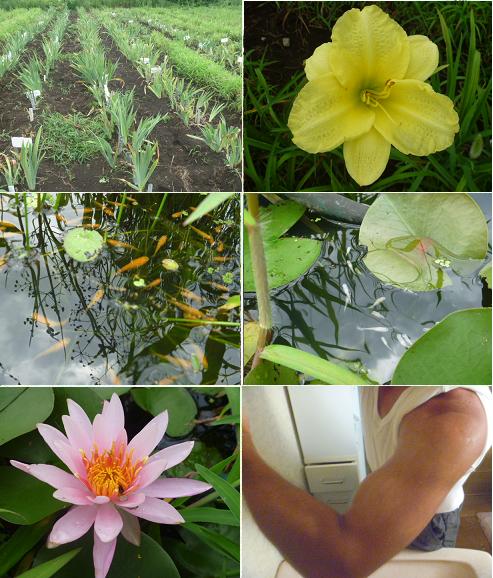 猛暑と台風の影響の雨で、畑の雑草も物凄い勢いです! 少し放って置くといつも間にか伸びています(><) 毎年の事で毎年雑草と戦っていますが、畑も広範囲のため、いつも。 雑草に負けてしまします。 除草剤等を使えば楽なのですが、土壌が悪くなるので、毎年手作業と 畝と畝の間は小さな耕運機でかき回し対応しています。 でも、雑草も元気に生える自然な土壌なので、ジャーマンアイリスの 腐りも最小限に抑えられます。 ジャーマンアイリスも植えた土地に馴染むまで数年はかかると思いま すが、化成肥料や除草剤もない自然な土だと安心して栽培できる 感じです♪ でも、夏場の雑草との戦いは大変ですが・・いつも雑草の勢いに 負けてしまします。(^_^;) 畑では趣味でメダカも池で買っていますが、春に生まれた楊貴妃メダカ と白メダカが成長中です。池ではスイレンも咲いています。 春からの畑仕事で、腕も真っ黒です!(*^^)v |