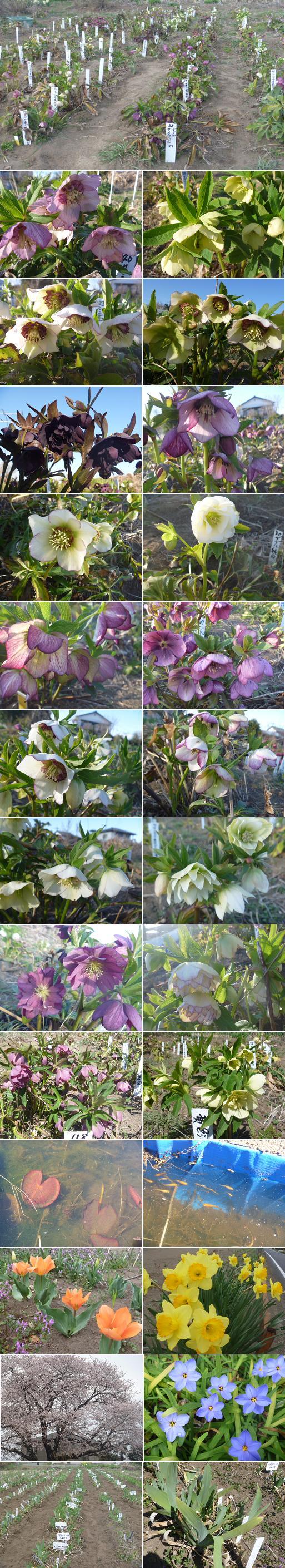 | ◆2013/3/27のジャーマンアイリス畑の様子: 今年は3月に入って暖かい日が続きましたが、3月後半になり、また肌寒い日 が続いています。早くポカポカ陽気の春になってもらいたいものです。 畑ではクリスマスローズが咲いています。メダカ池でのメダカの活動も活発に なりました。 ジャーマンアイリスは全体的にまだ葉の成長も今ひとつですが、これから急成長 すると思います。 ヘメロカリスも新芽を出し、これから急成長することでしょう。 群馬は、まだ寒いので桜は少し開花した状態です。 これから沢山の桜の蕾が開花するところです。 |