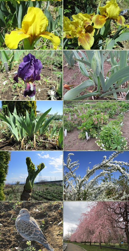 昨夜は雨でしたが、朝から晴れて気温も急上昇!!! 4月なのに30度近くあったようです(;^ω^) 今年の春は寒かったり少し暖かかったり、 ようやく暖かさも本格的になりそうな感じです♪ 雨の後の晴天で黄色いタンポポの花もたくさん咲いて いましたが、ミニ品種のジャーマンアイリスも昨日 から、咲きだしました! 早く咲く年より1週間くらい遅いですが、暖かい 日が続けば、これから挽回すると思います。 早咲きのトール品種も花茎が伸びているのも 一部で見かけました(^^)vこれから花茎ももっと 出てくると思います。 現在、5月のジャーマンアイリス園の一般開放 に向けて、畑の除草作業等で連日奮闘中です(;^ω^) 除草していると、鳩が芋虫を食べに来たりします(^^♪ 畑では、クリスマスローズの葉が新緑であふれ、 タラの木の芽も伸びて来ています。 今年もジャーマンアイリス園開放に向けて、5月まで もうひと踏ん張りです(*´▽`*) |